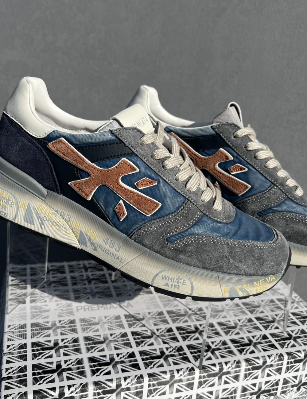 La chaussure se décline dans des tons de bleu et de gris et rouille pour un style décontracté