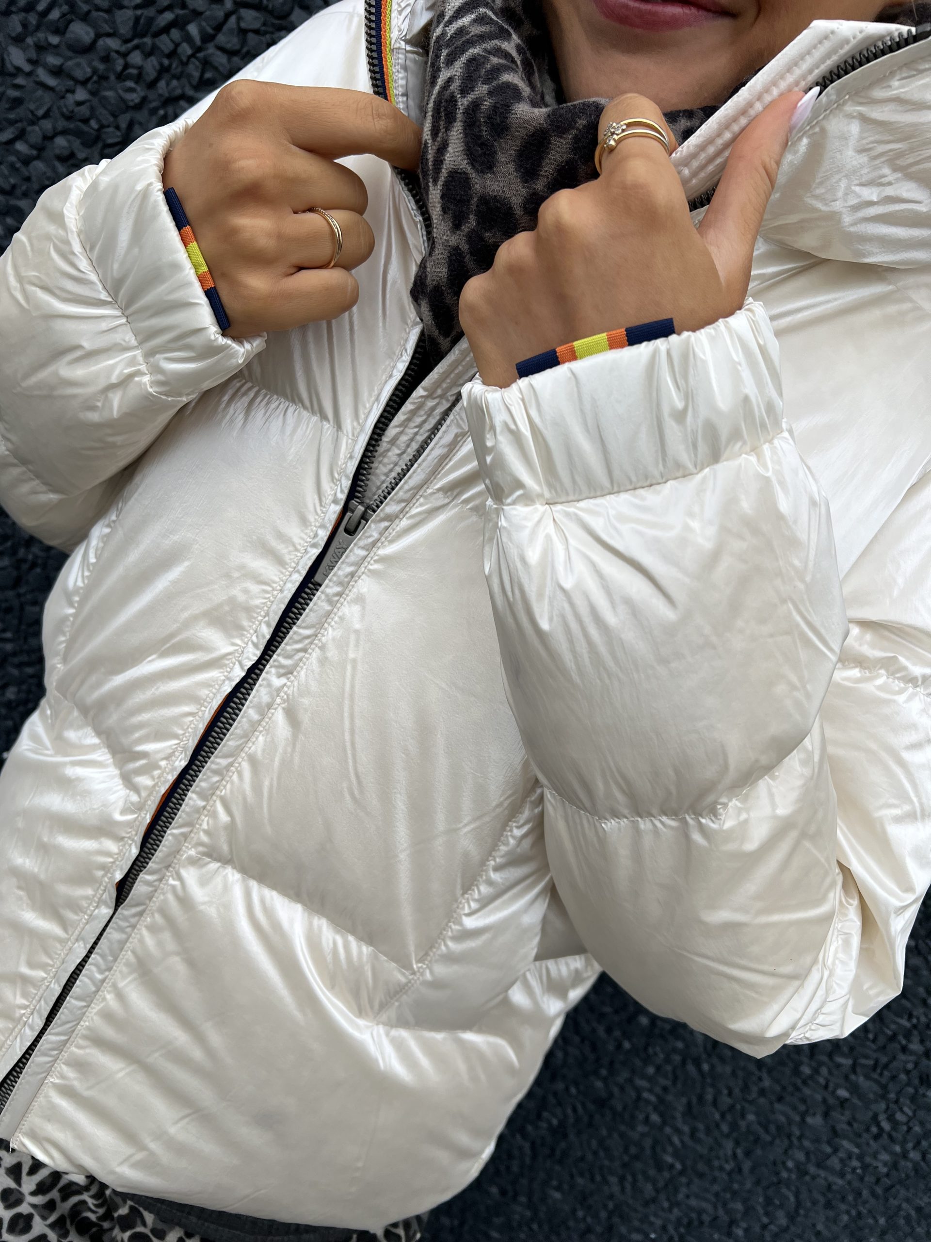 La veste dispose d’une capuche enveloppante et d’une fermeture éclair intégrale
